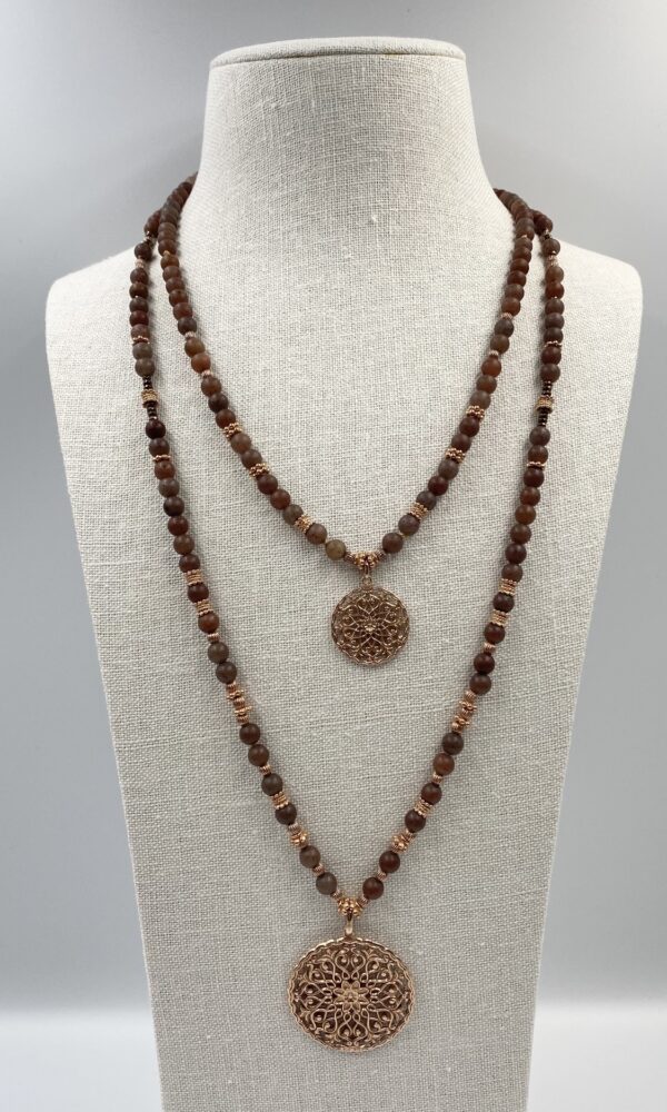 Diese Doppel-Halskette mit chocolate Achat, den 925 Silber rosé vergoldeten Anhängern & Elementen wiederspiegelt die warmen, erdigen Naturtöne und verleiht ihr durch den grossen Mandala-Anhänger Eleganz und ein Hauch von Luxus. Die Kette hat keinen Verschluss und eine Gesamtlänge von ca. 68 cm. Wird sie anliegend um den Hals getragen beträgt die Länge ca. 50cm.