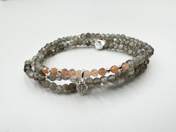 Dieses 3-fach Armband auf elastischem Faden mit hochwertigen Labradorit Steinen schimmert einzigartig und wird durch den Mondstein mit dem Silber 925 Herzanhänger harmonisch abgerundet.